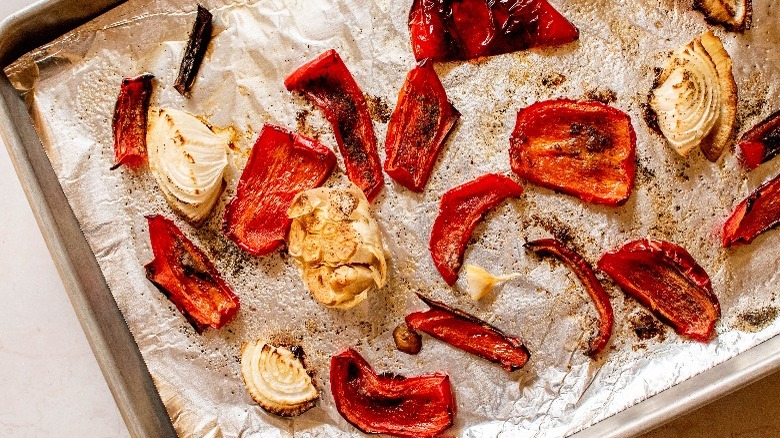 - Place the bell peppers skin-side down on a foil-lined baking sheet. Add the quartered onion and garlic and cover with olive oil and ½ tablespoon each of salt and pepper.