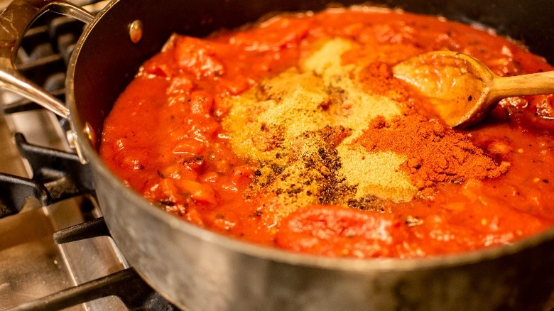 - Heat a deep skillet over medium heat. Add whole tomatoes and crush with the back of a spoon. Once crushed, add diced tomatoes, cumin, paprika, sumac, cinnamon, and coriander and stir together to combine. Bring to a simmer.