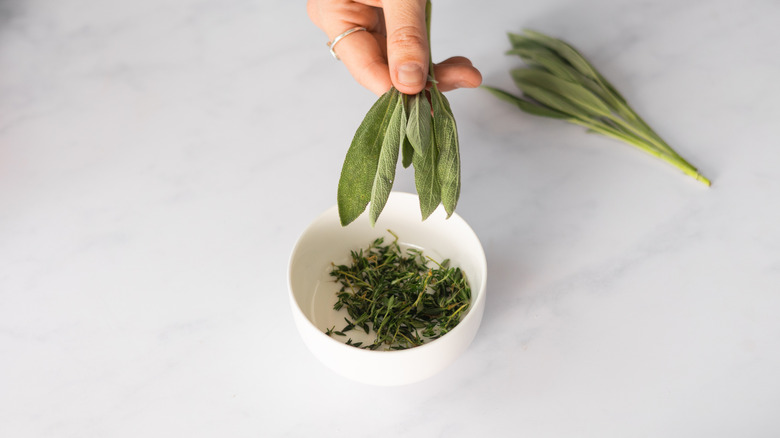 - Remove the thyme leaves from the sprigs, and discard the sprigs. Tear up the sage leaves.