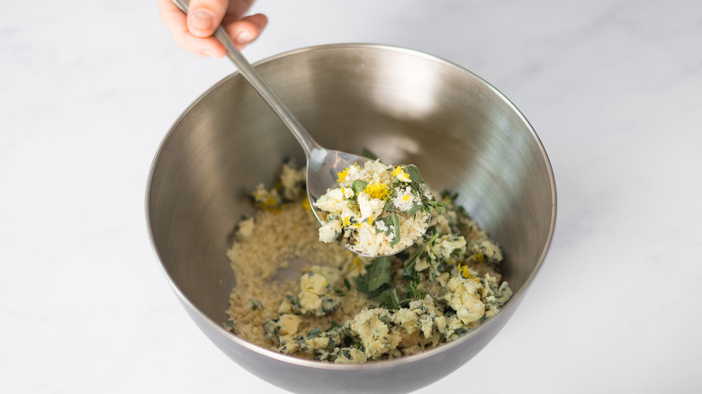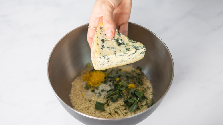 - Into a bowl, add the panko crumbs, thyme leaves, sage leaves, lemon zest, salt and pepper. Crumble the blue cheese into the bowl.
