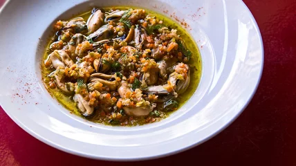 - Using a slotted spoon, transfer the mussels and vegetables to a serving dish. Garnish with olive oil, paprika and dill fronds, then serve with toasted bread and mayonnaise.