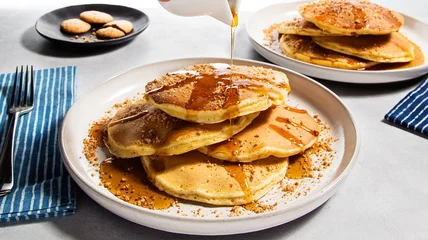 - Divide the pancakes between plates and garnish with more crushed amaretti cookies, then serve with maple syrup.