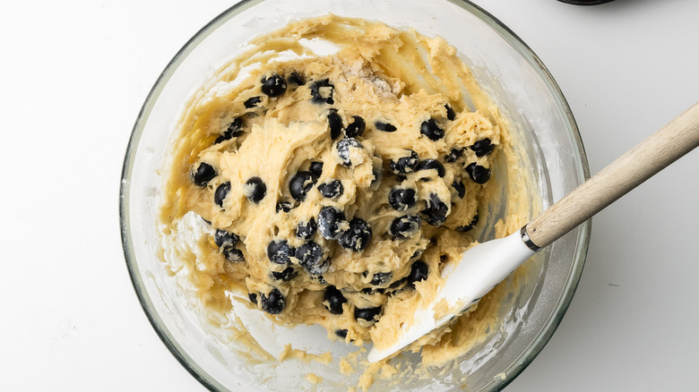 Once coated, fold the blueberries into the muffin batter. "You can definitely swap out the fresh blueberries for frozen blueberries," Bryant says. "If you do that then you'd want to use them frozen and directly out of the freezer, so that the blue color doesn't bleed into the muffin batter. The size of the blueberries, whether fresh or frozen, is most important though for the structure of the muffin. If you use large blueberries, the muffin batter can struggle to rise properly around them."