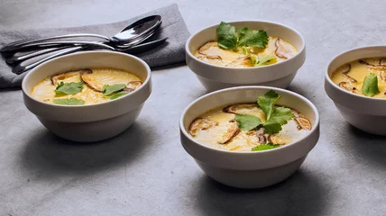 Literally translated to "steamed in a tea bowl," chawanmushi is a traditional, silky-smooth Japanese egg custard made of dashi thickened with eggs. One of the few Japanese dishes eaten with a spoon, chawanmushi is a dish served as part of a larger meal. Here, chunks of chicken, shrimp and shiitake mushroom, seasoned with soy sauce, are dispersed throughout, providing contrast to the smooth texture of the custard.