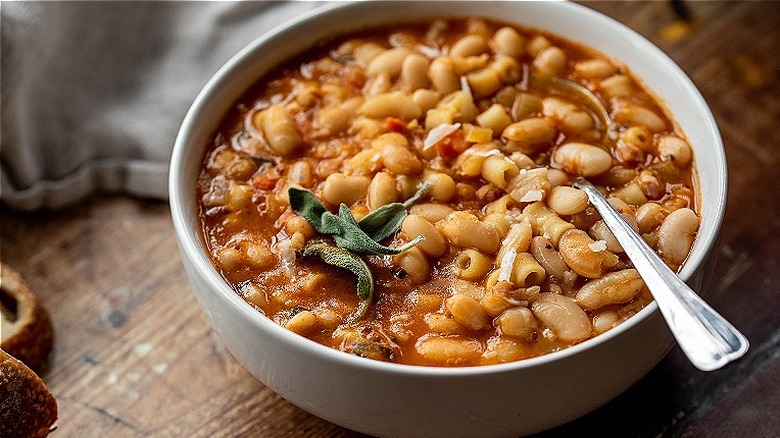 Pasta e fagioli is a classic Italian dish made up of small pasta, beans, and broth, a combination that creates a texture that is somewhere between a soup and a stew. Different from its tomato-based vegetable soup cousin, minestrone, traditional pasta fagioli always uses white beans to create a thick and creamy base for its herby, brothy pasta. While this recipe guides you through making a classically thick stewed pasta e fagioli, you can make it your own by adding more broth, less beans, or double the pasta. One thing you shouldn't change, though: The delicious autumnal addition of rosemary and sage.