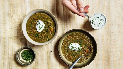 Starchy lentils are cooked in a broth with vegetables, thickening the broth as they begin to break apart. A dollop of herb-packed yogurt cuts through the rich soup, adding acidity and brightness. Tarragon, an herb common in French cuisine (think béarnaise sauce), adds a subtle floral flavor that will have everyone asking for the recipe.