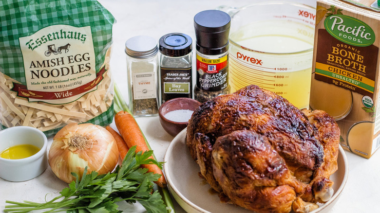 Is there anything more comforting than a bowl of chicken noodle soup? Perhaps the warm, brothy concoction brings back memories of being sick as a child — okay, admittedly not the fondest association, but it sure was nice to qualm those cold symptoms with a steaming bowl. While your parents may have cracked open a can back in the day, you can do better than that as an adult and make a homemade version. It's easier than you might think, especially if you follow this recipe from developer Jaime Shelbert, which allows for a few shortcuts (like using a pre-cooked rotisserie chicken) to maximize on convenience without sacrificing flavor.