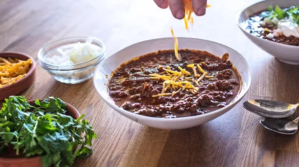 - Divide the chili among bowls; top with the onions, sour cream, shredded cheese, tortilla chips and cilantro; and serve.
