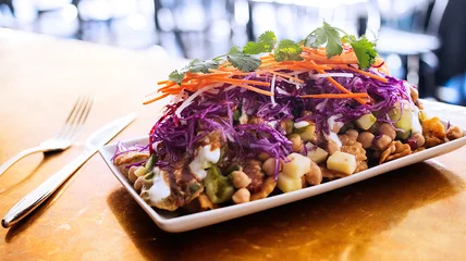 - For the assembly: Line a serving platter with the fried papadi. Top with the chickpea salad and drizzle with some of the yogurt sauce and tamarind dressing. Top with the pomegranate seeds, cilantro, red cabbage, carrot, beet and ginger. Serve with extra yogurt sauce and tamarind dressing on the side.