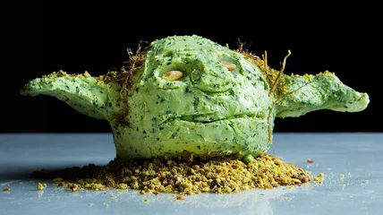 - Use a fish or offset spatula to lift Yoda onto the pistachio mixture. Serve immediately with the baguette slices or crackers. Enjoy it you will.