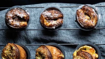 4. Remove the pan from the oven and let the popovers sit for 30 seconds to 1 minute. Turn them out and serve immediately. Rose-Cardamom Sugar Popovers: 5 tablespoons granulated white sugar 1½ teaspoons dried food-grade rose petals, crushed 1½ teaspoons ground cardamom ¼ teaspoon rose water, optional In a small bowl, mix all ingredients together. After removing the popovers from the oven, sprinkle with the sugar mixture. Turn out and sprinkle with the remaining sugar before serving. Parmesan-Lemon-Thyme Popovers: ½ cup finely grated Parmesan cheese 3 tablespoons chopped thyme ½ teaspoon freshly cracked black pepper Zest of 1 Meyer lemon, finely grated In a small bowl, mix all ingredients together. After greasing the popover pan, divide half of the cheese-herb mixture among the bottoms of the tins. Fill each tin with the batter and evenly distribute the remaining mixture over top, sprinkling over the batter. Bake as usual. Pop out then serve.