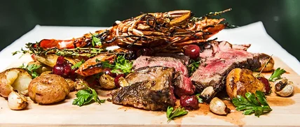 - Assemble the dish: In a small bowl, toss the parsley with the lemon juice and olive oil, and season with salt. Slice the steak off the bone and arrange on the serving platter. Spoon about 1 tablespoon of the vanilla butter over the steak and arrange the prawns and potatoes on the board as well. Scatter the cherries, garlic and fried thyme. Garnish with the dressed parsley. Serve.