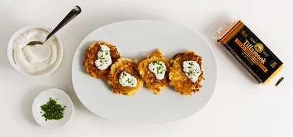 Learn to make a potato and cheese pancakes using Tillamook Extra Sharp Cheddar Cheese