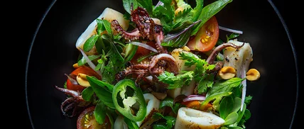 Learn to make a squid salad with cherry tomatoes, purslane, roasted peanuts, Thai basil and lime.