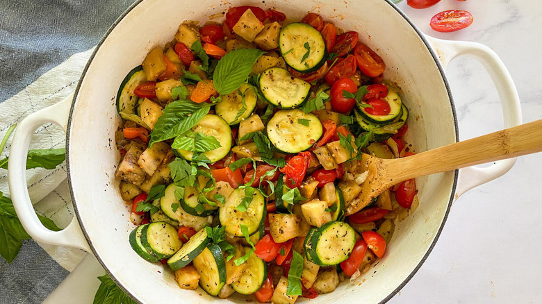 As for what goes into a ratatouille, this can vary from cook to cook, but for this recipe, Hahn insists that "fresh herbs are such a key ingredient here" due to the fact that "they add an element of freshness and flavor to the cooked vegetables." She also employs a less-common technique for flavoring the dish with garlic. While many recipes call for sautéing it along with the onions, she prefers to roast it instead, as she feels that "roasting a full bulb of garlic gives you a sweeter, buttery, and caramelized flavor." (If you like the toasty allium in ratatouille, chances are you'll love roasted garlic in mashed potatoes, too.)