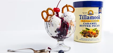 The ice cream sundae is the ultimate frozen dessert construction. This version, featuring Tillamook Caramel Butter Pecan ice cream topped with crunchy pretzel brittle, blueberry sauce and fresh blueberries, is a decadent treat.