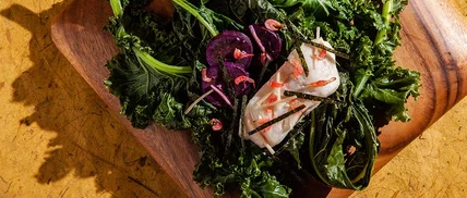 For a more modern take on steamed black cod, Chris Kajioka wraps the fish in kale instead of traditional taro leaves. Don't skimp on the dried shrimp, as its provides another added layer of funky flavor.