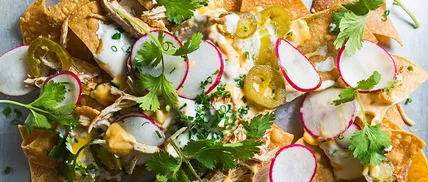 - Assemble the nachos: Place the tortilla chips on a parchment-lined rimmed sheet tray. Top with the shredded chicken and pour the cheese sauce over it. Garnish with the crema, radishes, pickled jalapeños, cilantro leaves and chives. Serve.