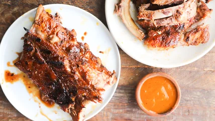 Preheat either a propane or charcoal grill to medium-high heat. "At this stage, the ribs are cooked so we are really just finishing them," says Murray. Place the ribs on the grill and cook until slightly charred while brushing with the glaze. The ribs should be sticky and coated with some deeply golden brown bits. Serve immediately or wrap and refrigerate for up to three days.