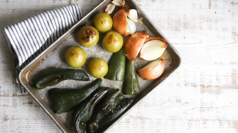 - Heat broiler and move oven rack to top level. Toss poblanos, jalapeño, yellow onion, garlic, and tomatillos in oil. Add a pinch of salt and transfer to a rimmed baking sheet. Broil vegetables until browned, rotating tray often, about 12 minutes. Remove from oven and let cool. Return oven rack to middle level and turn oven to 425 F.