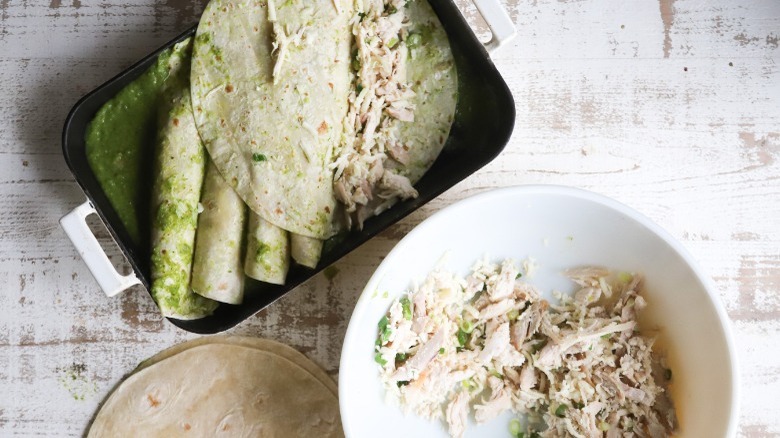 Fill your dish with some of the sauce and dip a tortilla in, making sure to coat both sides. This recipe skips the step of frying the tortilla in oil first, which does change the texture but isn't strictly required. "Because this recipe uses flour tortillas," says Murray, "the tortilla and chicken/cheese filling ends up kind of melting together in a really delicious way." If you want to be more traditional, you could make this same recipe with corn tortillas and dip them in hot oil before filling.