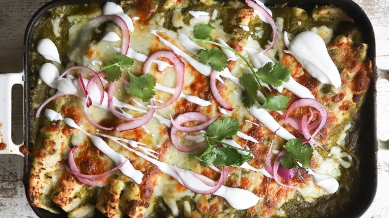 - Thin sour cream with about a tablespoon of water. Drizzle over the enchiladas, then top with marinated red onion and reserved sprigs of cilantro, if using.
