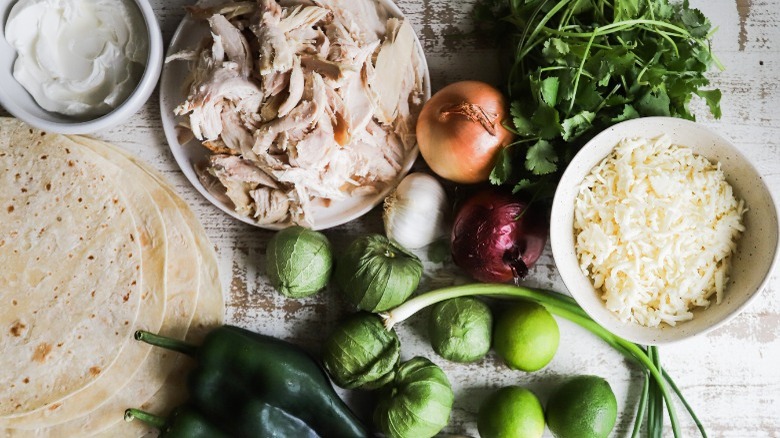 For the enchilada sauce, you'll need poblano and jalapeño peppers, tomatillos, a white or yellow onion, garlic, limes, and cilantro. The final dish gets topped with sour cream, marinated sliced red onion, and a few extra sprigs of cilantro.
