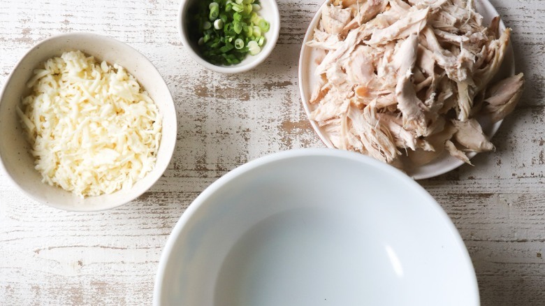 In a large bowl combine the chicken, half the cheese, and the green onion. This is a great opportunity to introduce other elements, if you have a mind for it. Instead of green onion, try charred spring onion. You could also add some extra chopped roasted peppers for more spice.