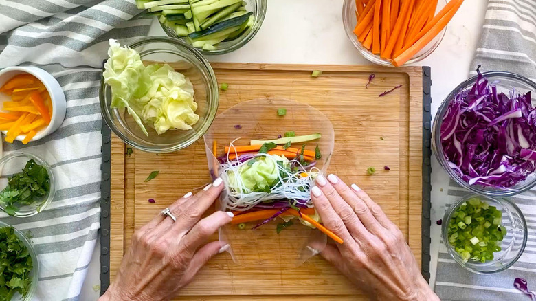 - Using a shallow pan, submerge a spring roll wrapper in water for about 10 seconds until it softens, then lay it on a work surface (cutting board or clean dish towel) and start layering in the veggies. Start with the lettuce, then add the carrots, cucumber, cabbage, bell pepper, scallions, cilantro, mint leaves, and some of the noodles. Make sure to leave about an inch border to wrap the roll.