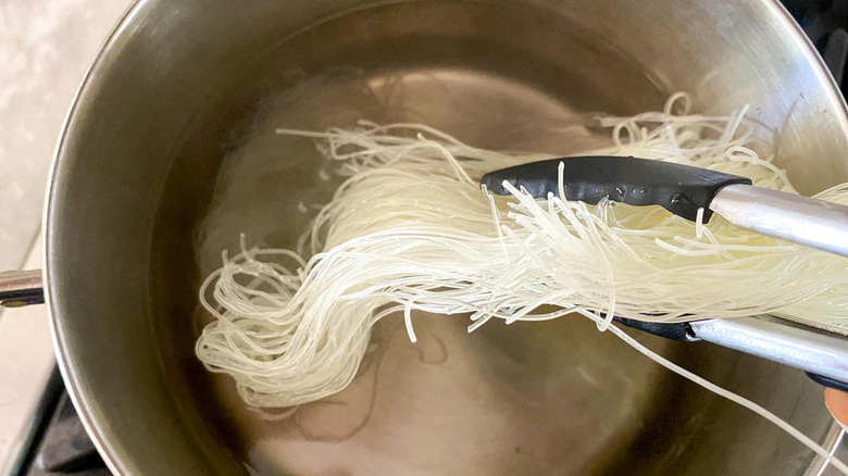Add water to a medium-sized pot and get it boiling on the stovetop. Once boiling, remove the water from the heat, and drop in the rice noodles. Allow them to sit in the hot water for 10 minutes, during which time they will soften. You should also look at the package's instructions for how to cook the noodles — different brands or types may vary slightly.