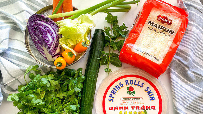To make these refreshing spring rolls, you'll need butter lettuce (stemmed and chopped), carrots (cut into thin strips), an English cucumber (cut into thin strips), thinly sliced purple cabbage, sliced bell pepper, chopped scallions, chopped cilantro, chopped mint leaves, thin rice or glass noodles, and round spring roll wrappers.