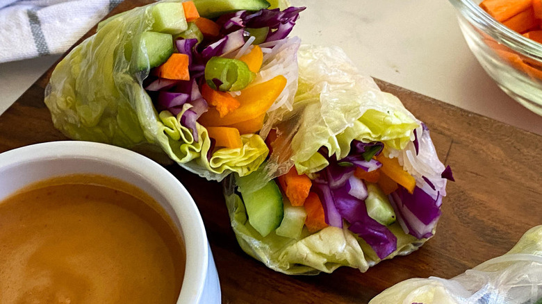 Once you've rolled up the last of the spring rolls, you're ready to serve. Hahn likes to serve these crispy, crunchy rolls with a squeeze of lime and some peanut sauce, but you certainly don't have to stop there. "Other than the peanut sauce, I also like dipping [them] in a spicy sriracha sauce, a ranch dip, or a creamy avocado dip," she suggests. Also, she notes that these are definitely more of a snack than a meal, but they pair quite well with soup — a hearty red pepper soup or a Mexican rice soup would definitely round out the dish.