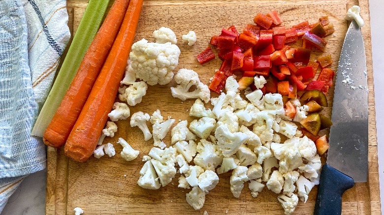 - While the peppers are cooking, cut the cauliflower into small ½-inch florets and cut the red pepper into ½-inch pieces. Slice the carrots, celery, and garlic into thin slices.