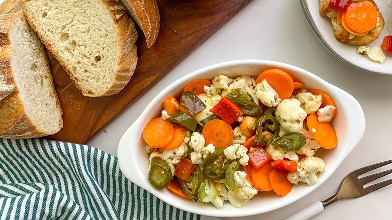 - When the hot peppers are cool enough to handle, slice them into ¼-inch pieces. In a large bowl, combine the peppers with the cauliflower, red pepper, carrots, celery, garlic, olive oil, celery seeds, and oregano. Then pour in the reserved pickling liquid.