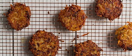- Line a rimmed baking sheet with parchment paper. Using a 2-inch ring mold, form 16 potato pancakes using large spoonfuls. Place the potato pancakes onto the baking sheet and chill in the freezer for 30 minutes.