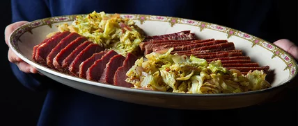 To "corn" the brisket for this Irish American dish, the meat brines for six days before getting slow-cooked in a pot filled with aromatics. The pink curing salt gives the meat its signature pink hue and briny flavor. Serve it with charred cabbage spiked with Guinness.