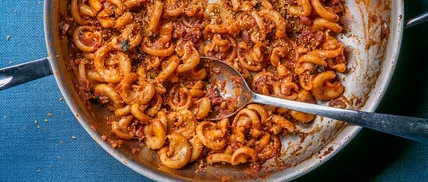 - In a large, shallow pot over medium heat, add the beef fat. When the beef fat is hot, add the onion-tomato mixture and red pepper flakes. Season with salt and pepper, and cook, stirring often, until the vegetables are completely softened and any excess liquid has evaporated, 8 to 10 minutes. Add the tomato paste and cook until the mixture begins to caramelize, 4 to 5 minutes. Add the red wine and reduce by half, 10 to 12 minutes.