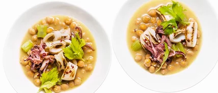 - Serve the squid over the chickpea stew. Top with a drizzle of olive oil.