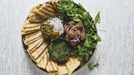- Garnish the meatballs with the sumac or Aleppo pepper and serve on a platter with the green raisin pesto, pita, onions, pickled jalapeños and herbs.