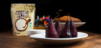 - Meanwhile, make the poached pears: Combine the wine, Sugar In the Raw Organic White®, star anise, vanilla bean and salt in a 4-quart saucepan over medium-high heat, stirring until the sugar dissolves. Bring the liquid to a simmer and add the pears; add water if needed to completely submerge pears in cooking liquid. Cover, leaving the lid ajar, and simmer until the pears are tender, about 50 minutes.