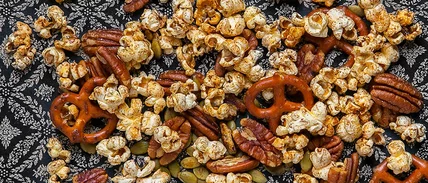 3. In a large bowl, combine the popcorn, pecans, pretzels and pumpkin seeds and toss with the spiced bacon fat until evenly coated. Season with salt, if needed. Divide the popcorn mix between two parchment-lined sheet trays and bake, stirring every 15 minutes, until the mix is toasted and fragrant, about 45 minutes. Remove the pan from the oven and serve warm.