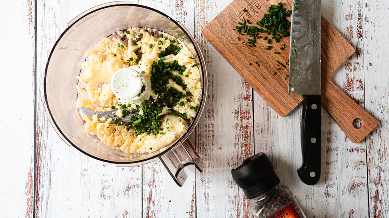 Either transfer the cheese mixture to a bowl or simply keep it in the food processor bowl. Either way, add in the chopped chives and black pepper, and fold gently to combine.
