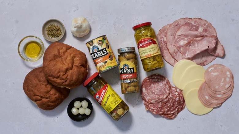 Gather the ingredients for a classic muffuletta
