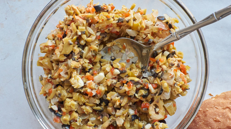 Like giardiniera, the olive salad used on muffulettas is mostly pickled items chopped up and doused in oil. If you don't like spicy giardiniera, we recommend swapping it for carrots and cauliflower. The olive salad is briney and salty thanks to the heavy use of olives, but if you don't like olives, we still recommend giving the relish a try. When slathered across bread and topped with meat and cheese, the salt is a welcome addition, and our use of giardiniera is a pleasant spicy surprise.