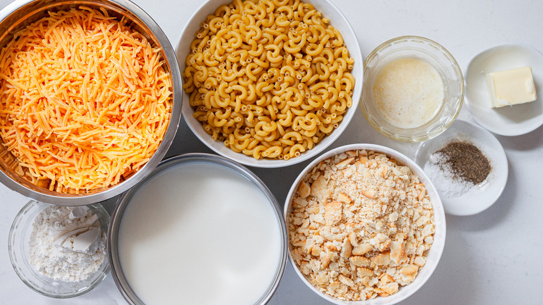 To make this macaroni and cheese, you'll need both macaroni (the elbow-type are classic) as well as cheese — sharp cheddar makes for a nice contrast with the pasta. The other ingredients you'll need are flour and milk for the sauce, salt and pepper to season the dish, and crackers and butter for the topping.