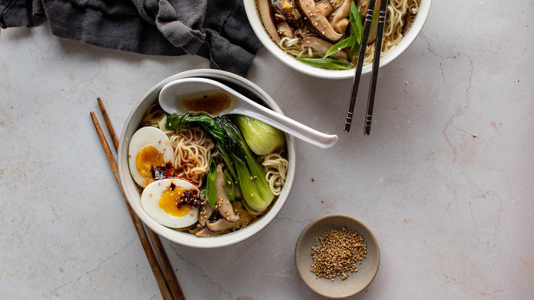 Who among us doesn't have at least one trusty pack of instant ramen noodles in the cupboard? If your college days were anything like ours, you probably once lived off of a whole cabinet full of them (and have since sworn off ever buying them again). Fortunately, those cheap instant noodles can be dressed up with a few simple ingredients for a fancy, healthy version of that same quick and easy meal. Forget the flavor packet — just grab some soy sauce and mushrooms and make your own delicious broth.