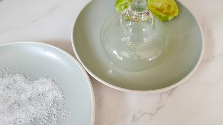 Speaking of rimming the glasses, that's the first step in making these drinks. Dalton says that for a frozen margarita, "you can use any type of tall highball glass or margarita glass, as long as the rim is wide [enough] to salt the edges." Once you've selected the glassware, run a lime wedge around the rims of both glasses, then dip them in the salt.