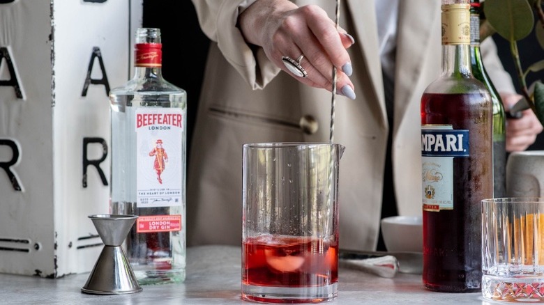 Take out a mixing glass and add the gin, vermouth, and Campari. You will also need a few ice cubes. Give the liquid a few stirs to mix.