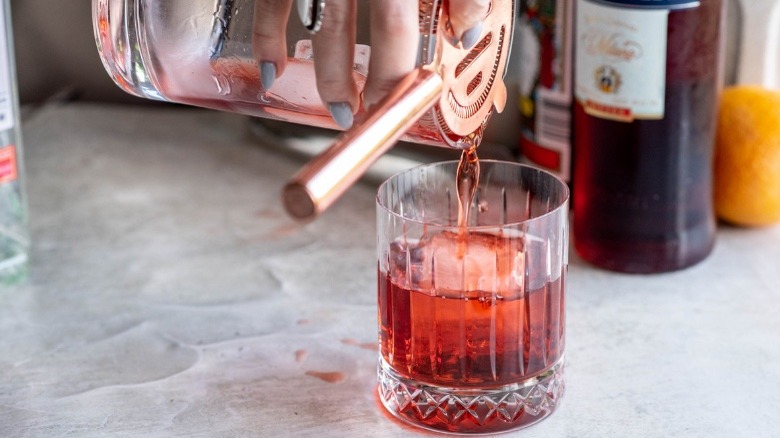 - Strain into a rocks glass over a large ice cube.