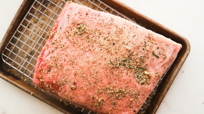 Evenly coat the roast with the spice rub, paying special attention to the fat cap on top. The bottom where the bones are doesn't need so much as this area will end up being removed before slicing. Transfer the whole roast to the refrigerator and let sit uncovered overnight.